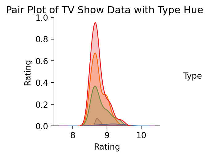 plt.suptitle('Pair Plot of TV Show Data with Type Hue', y=1.02)