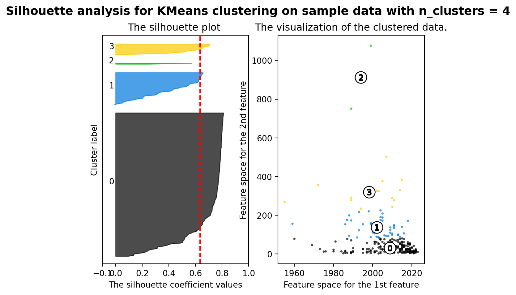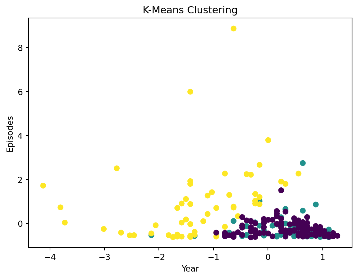print(df[['Name', 'Year', 'Episodes', 'Rating', 'Cluster']])Cluster Labels: