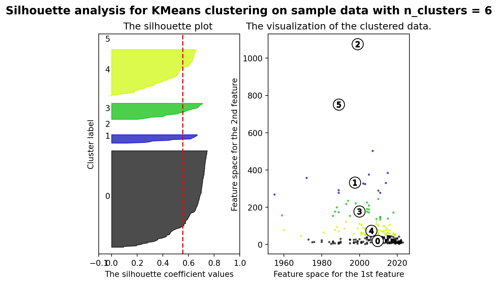 For n_clusters = 6 The average silhouette_score is : 0.5557296368153766