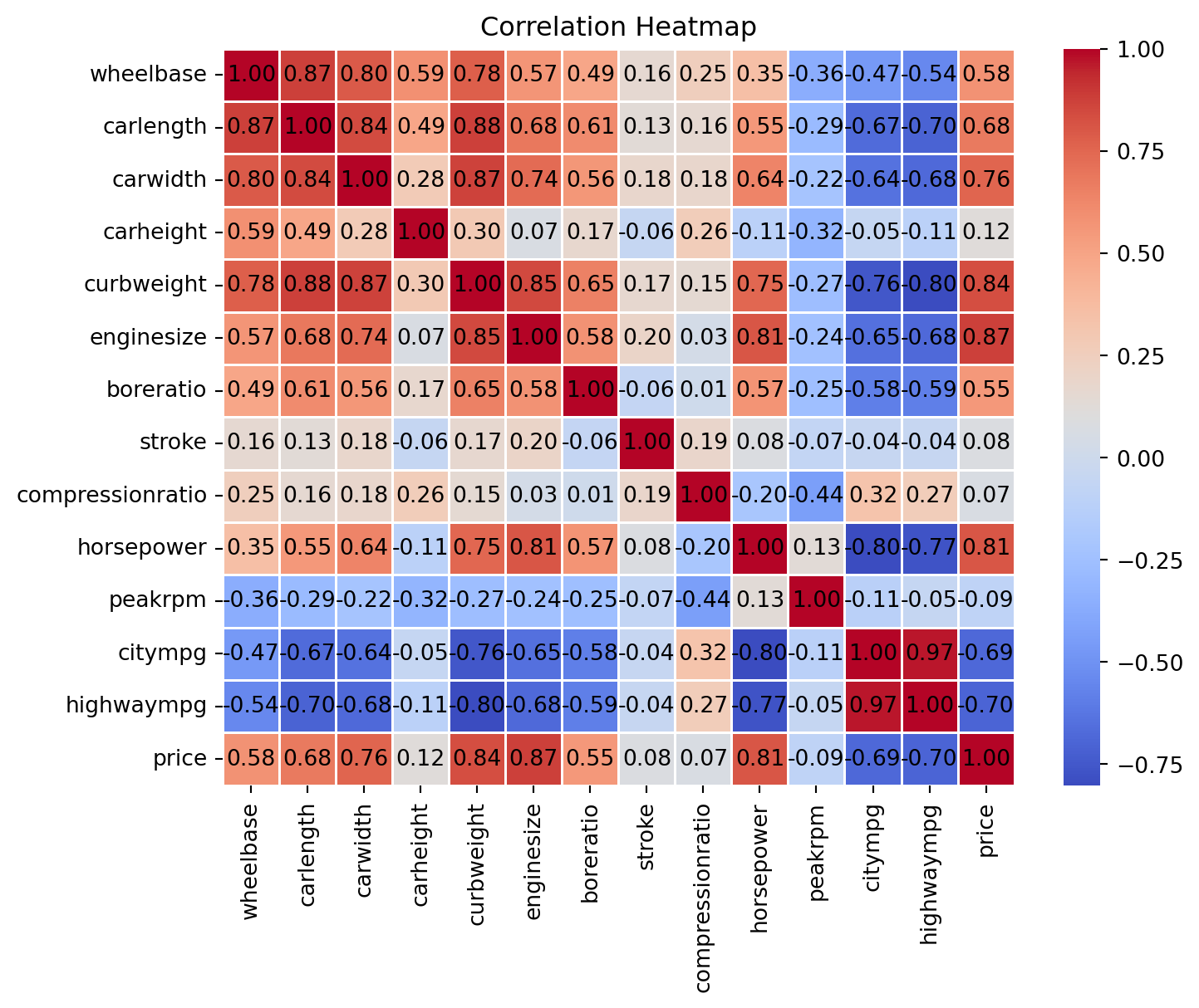 'compressionratio', 'horsepower', 'peakrpm', 'citympg', 'highwaympg',